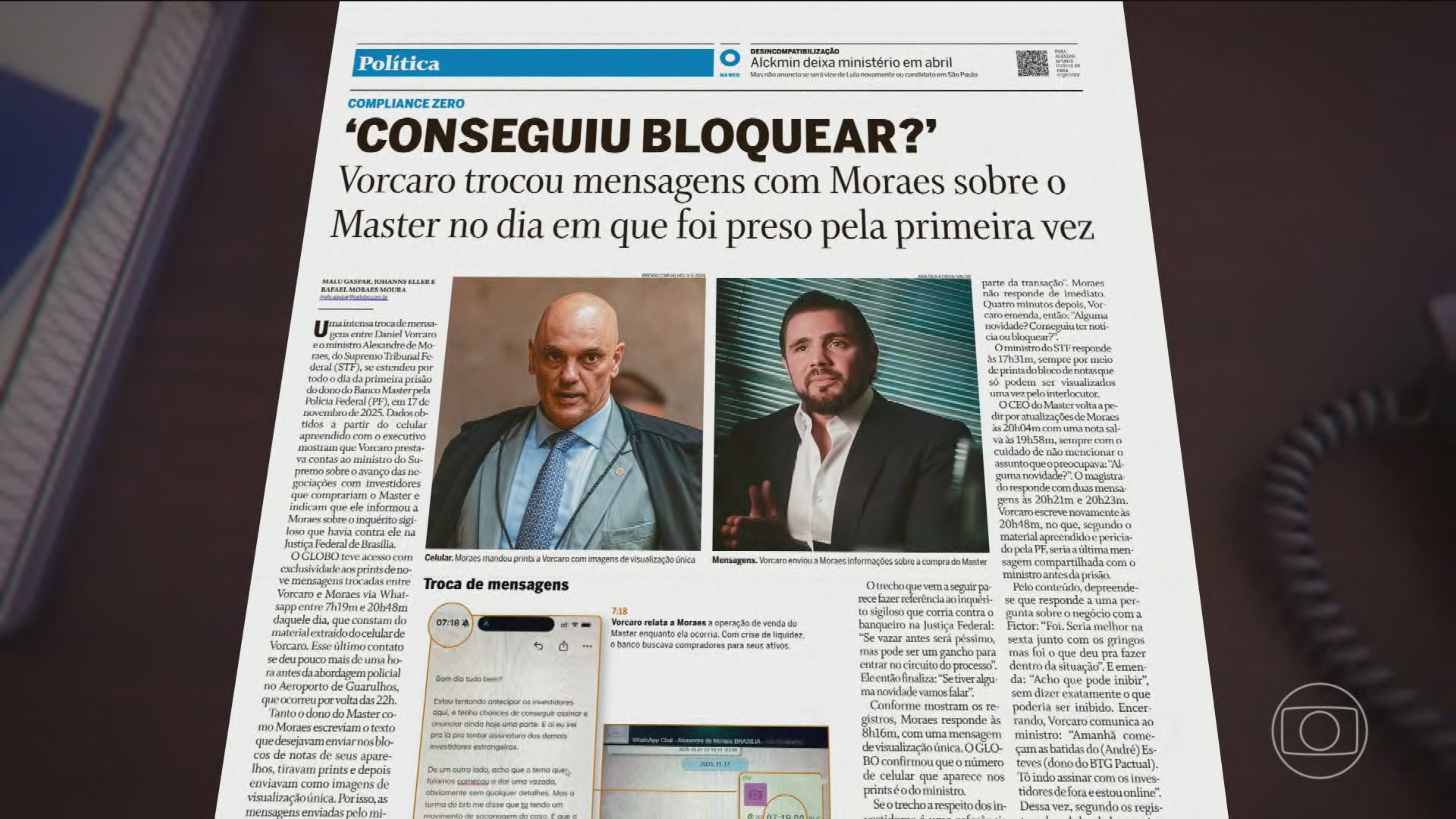 O Globo: Mensagens trocadas entre Vorcaro e Alexandre de Moraes foram extraídas e periciadas pela PF Uma reportagem do jornal “O Globo” revelou mensagens que o dono do Banco Master, Daniel Vorcaro, enviou para o ministro do Supremo Alexand...